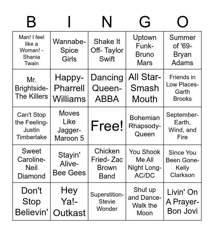 This bingo card has a free space and 24 words: Stayin' Alive- Bee Gees, Hey Ya!- Outkast, Dancing Queen- ABBA, Don't Stop Believin', Summer of '69- Bryan Adams, Man! I feel like a Woman! - Shania Twain, Mr. Brightside- The Killers, Wannabe- Spice Girls, Bohemian Rhapsody- Queen, Chicken Fried- Zac Brown Band, All Star- Smash Mouth, Can't Stop the Feeling- Justin Timberlake, You Shook Me All Night Long- AC/DC, Since You Been Gone- Kelly Clarkson, Happy- Pharrell Williams, Shut up and Dance- Walk the Moon, September- Earth, Wind, and Fire, Shake It Off- Taylor Swift, Friends in Low Places- Garth Brooks, Moves Like Jagger- Maroon 5, Livin' On A Prayer- Bon Jovi, Sweet Caroline- Neil Diamond, Uptown Funk- Bruno Mars and Superstition- Stevie Wonder.
