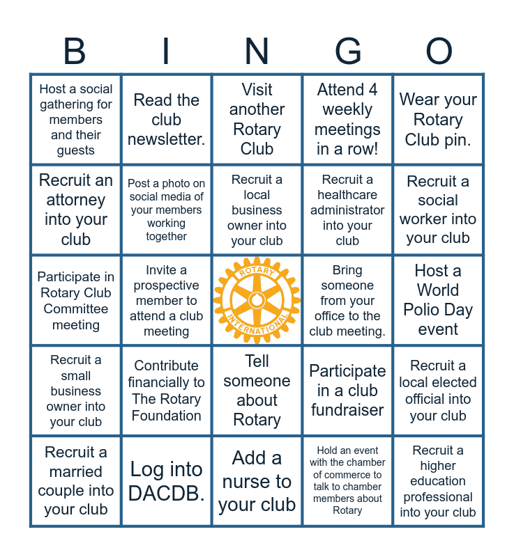 This bingo card has a free space and 56 words: Get an article about your club published, Invite a prospective member to attend a club meeting, Share a Rotary Club post on social media., Attend 4 weekly meetings in a row!, Volunteer for a Rotary Club Service Project, Partner with a community organization on a service project or event, Read the club newsletter., Invite a prospective member to a service project., Bring someone from your office to the club meeting., Help set up and clean up at a meeting, Host a social gathering for members and their guests, Log into DACDB., Invite a former member to re-engage, Meet with another club member for coffee, lunch, etc, Attend a Rotary Board meeting., Contribute financially to The Rotary Foundation, Visit another Rotary Club, Participate in a club fundraiser, Get a hole sponsorship for our Golf Tournament, Participate in Rotary Club Committee meeting, Post a photo on social media of your members working together, Tell someone about Rotary, Start a giving plan to become a Paul Harris Fellow., Wear your Rotary Club pin., Partner with another club on a project, Host a World Polio Day event, Ask a retired member to talk about their former profession at a club meeting, Share a member's accomplishments on social media, Recruit a local business owner into your club, Recruit a school administrator into your club, Recruit a college student into your club, Recruit a parent of a youth exchange student, Recruit someone from the construction industry into your club, Recruit a marketing professional into your club, Hold an event with the chamber of commerce to talk to chamber members about Rotary, Recruit a social worker into your club, Recruit an attorney into your club, Add a doctor to your club, Add a nurse to your club, Recruit a healthcare administrator into your club, Recruit a higher education professional into your club, Recruit a married couple into your club, Recruit someone from the automotive industry, Add a librarian to your club, Recruit a retail worker into your club, Recruit a local elected official into your club, Recruit a small business owner into your club, Get a former member to re-join your club, Add a banker to your club, Add a gym owner to your club, Recruit a musician into your club, Add a computer technology professional to your club, Recruit an IT professional into your club, Add a mental health professional to your club, Host a club hike and encourage members to bring a friend to the trails and Recruit a veteran into your club.