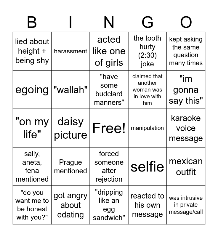 This bingo card has a free space and 24 words: Prague mentioned, got angry about edating, "have some budclard manners", "do you want me to be honest with you?", kept asking the same question many times, lied about height + being shy, egoing, harassment, manipulation, forced someone after rejection, claimed that another woman was in love with him, "on my life", selfie, mexican outfit, "wallah", reacted to his own message, karaoke voice message, acted like one of girls, "im gonna say this", daisy picture, was intrusive in private message/call, sally, aneta, fena mentioned, the tooth hurty (2:30) joke and "dripping like an egg sandwich".