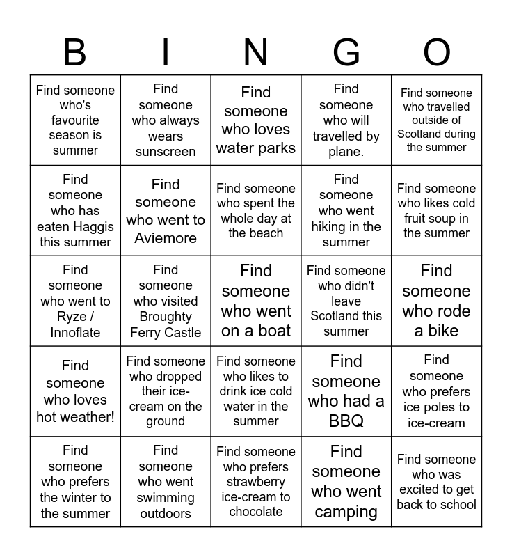 This bingo card has a free space and 24 words: Find someone who dropped their ice-cream on the ground, Find someone who went swimming outdoors, Find someone who spent the whole day at the beach, Find someone who prefers the winter to the summer, Find someone who travelled outside of Scotland during the summer, Find someone who's favourite season is summer, Find someone who has eaten Haggis this summer, Find someone who always wears sunscreen, Find someone who didn't leave Scotland this summer, Find someone who likes to drink ice cold water in the summer, Find someone who went hiking in the summer, Find someone who went to Ryze / Innoflate, Find someone who had a BBQ, Find someone who prefers ice poles to ice-cream, Find someone who went to Aviemore, Find someone who went camping, Find someone who rode a bike, Find someone who loves water parks, Find someone who likes cold fruit soup in the summer, Find someone who visited Broughty Ferry Castle, Find someone who was excited to get back to school, Find someone who loves hot weather!, Find someone who will travelled by plane. and Find someone who prefers strawberry ice-cream to chocolate.