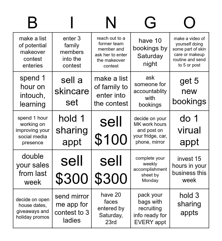 This bingo card has 25 words: sell $300, have 20 faces entered by Saturday, 23rd, make a list of family to enter into the contest, decide on open house dates, giveaways and holiday promos, make a video of yourself doing some part of skin care or makeup routine and send to 5 or post, make a list of potential makeover contest enteries, spend 1 hour on intouch, learning, enter 3 family members into the contest, decide on your MK work hours and post on your fridge, car, phone, mirror, sell $300, ask someone for accountablity with bookings, spend 1 hour working on improving your social media presence, complete your weekly accomplishment sheet by Monday, invest 15 hours in your business this week, sell a skincare set, hold 3 sharing appts, do 1 virual appt, reach out to a former team member and ask her to enter the makeover contest, get 5 new bookings, hold 1 sharing appt, sell $100, send mirror me app for contest to 3 ladies, double your sales from last week, have 10 bookings by Saturday night and pack your bags with recruiting info ready for EVERY appt.