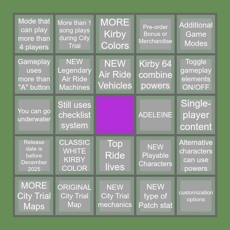 This bingo card has 24 images, a free space and 24 words: CLASSIC WHITE KIRBY COLOR, ORIGINAL City Trial Map, NEW Air Ride Vehicles, MORE City Trial Maps, Additional Game Modes, Mode that can play more than 4 players, Gameplay uses more than "A" button, More than 1 song plays during City Trial, ADELEINE, Top Ride lives, Kirby 64 combine powers, You can go underwater, NEW Playable Characters, Alternative characters can use powers, NEW Legendary Air Ride Machines, NEW type of Patch stat, Single-player content, MORE Kirby Colors, Toggle gameplay elements ON/OFF, Still uses checklist system, customization options, Release date is before December 2025, Pre-order Bonus or Merchandise and NEW City Trial mechanics.