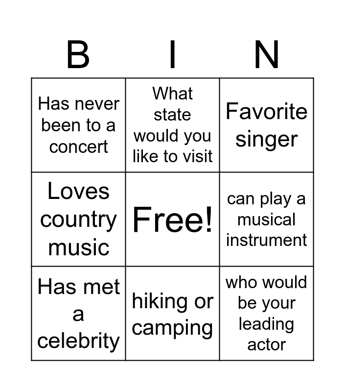 This bingo card has a free space and 21 words: Favorite color, Favorite food, What state would you like to visit, What is your favorite sport, Loves to swim, Has met a celebrity, Has never been to a concert, Favorite singer, loves spicy food, hiking or camping, loves to sing karaoke., Loves country music, prefers tea over coffee, hidden talent, can play a musical instrument, Favorite BarBQ, Favorite Movie, favorite movie genre, who would be your leading actor, favorite season and favorite dessert.