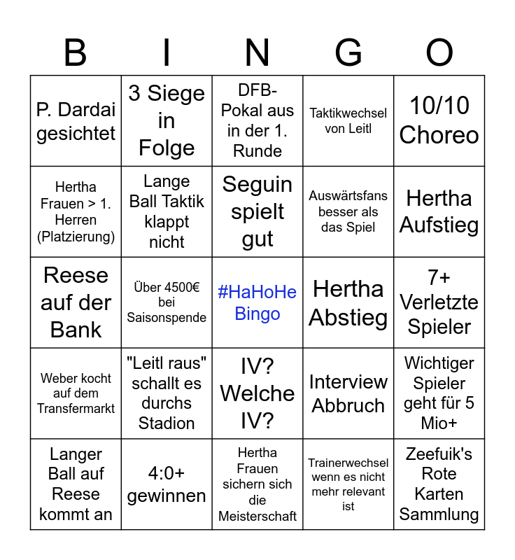 This bingo card has a free space and 24 words: "Leitl raus" schallt es durchs Stadion, 4:0+ gewinnen, Seguin spielt gut, Langer Ball auf Reese kommt an, 10/10 Choreo, P. Dardai gesichtet, Hertha Frauen > 1. Herren (Platzierung), 3 Siege in Folge, Hertha Abstieg, IV? Welche IV?, Auswärtsfans besser als das Spiel, Reese auf der Bank, Interview Abbruch, Wichtiger Spieler geht für 5 Mio+, Lange Ball Taktik klappt nicht, Trainerwechsel wenn es nicht mehr relevant ist, 7+ Verletzte Spieler, DFB-Pokal aus in der 1. Runde, Hertha Aufstieg, Über 4500€ bei Saisonspende, Zeefuik's Rote Karten Sammlung, Weber kocht auf dem Transfermarkt, Taktikwechsel von Leitl and Hertha Frauen sichern sich die Meisterschaft.