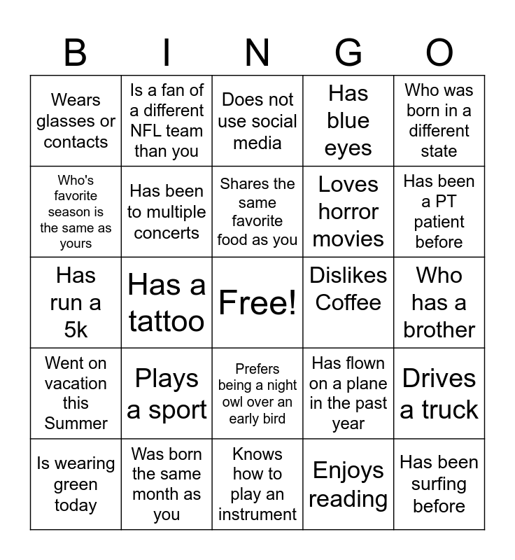 This bingo card has a free space and 29 words: Is wearing green today, Has traveled to a different country, Has a tattoo, Is left-handed, Wears glasses or contacts, Does not use social media, Has been to multiple concerts, Plays a sport, Dislikes Coffee, Was born the same month as you, Who has a brother, Has been surfing before, Knows how to play an instrument, Enjoys reading, Has been a PT patient before, Can whistle, Prefers being a night owl over an early bird, Went on vacation this Summer, Who was born in a different state, Has run a 5k, Has flown on a plane in the past year, Is a middle child, Loves horror movies, Who's favorite season is the same as yours, Has blue eyes, Is a fan of a different NFL team than you, Drives a truck, Shares the same favorite food as you and Has a dog.