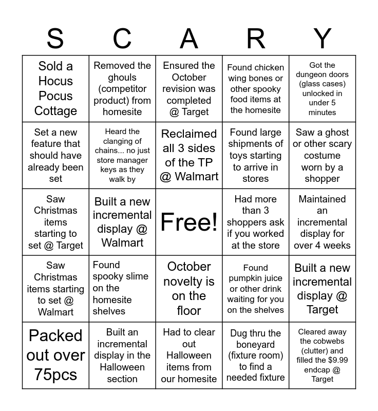 This bingo card has a free space and 24 words: Found spooky slime on the homesite shelves, Built an incremental display in the Halloween section, Reclaimed all 3 sides of the TP @ Walmart, Packed out over 75pcs, Got the dungeon doors (glass cases) unlocked in under 5 minutes, Sold a Hocus Pocus Cottage, Set a new feature that should have already been set, Removed the ghouls (competitor product) from homesite, Had more than 3 shoppers ask if you worked at the store, October novelty is on the floor, Found large shipments of toys starting to arrive in stores, Saw Christmas items starting to set @ Target, Found pumpkin juice or other drink waiting for you on the shelves, Built a new incremental display @ Target, Heard the clanging of chains... no just store manager keys as they walk by, Dug thru the boneyard (fixture room) to find a needed fixture, Maintained an incremental display for over 4 weeks, Ensured the October revision was completed @ Target, Saw a ghost or other scary costume worn by a shopper, Built a new incremental display @ Walmart, Cleared away the cobwebs (clutter) and filled the $9.99 endcap @ Target, Saw Christmas items starting to set @ Walmart, Found chicken wing bones or other spooky food items at the homesite and Had to clear out Halloween items from our homesite.