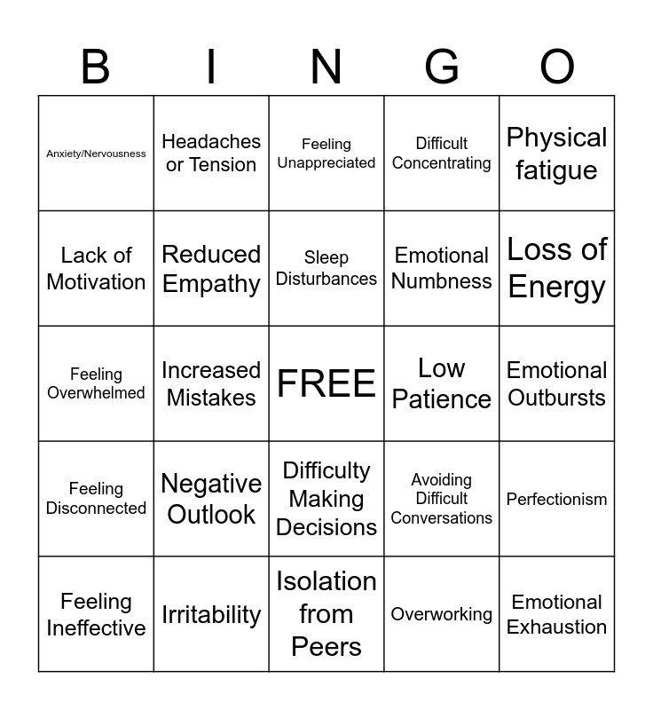 This bingo card has a free space and 25 words: Negative Outlook, Isolation from Peers, Sleep Disturbances, Feeling Ineffective, Physical fatigue, Anxiety/Nervousness, Lack of Motivation, Headaches or Tension, Low Patience, Difficulty Making Decisions, Emotional Numbness, Feeling Overwhelmed, Avoiding Difficult Conversations, Perfectionism, Reduced Empathy, Forgetfulness, Emotional Outbursts, Feeling Unappreciated, Loss of Energy, Increased Mistakes, Emotional Exhaustion, Irritability, Feeling Disconnected, Difficult Concentrating and Overworking.