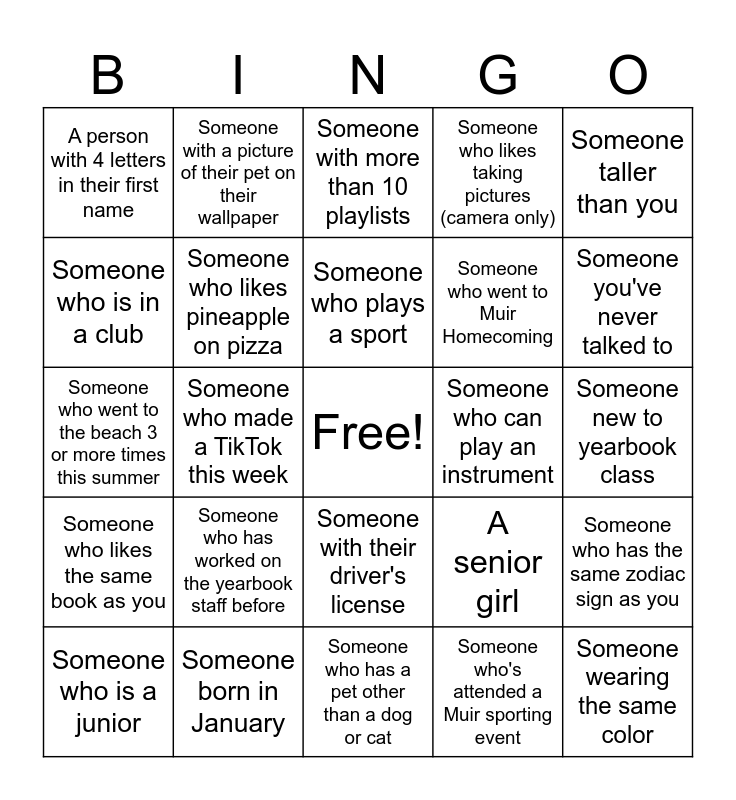 This bingo card has a free space and 24 words: Someone who has worked on the yearbook staff before, Someone born in January, Someone who plays a sport, Someone who is a junior, Someone taller than you, A person with 4 letters in their first name, Someone who is in a club, Someone with a picture of their pet on their wallpaper, Someone who can play an instrument, Someone with their driver's license, Someone who went to Muir Homecoming, Someone who went to the beach 3 or more times this summer, A senior girl, Someone who has the same zodiac sign as you, Someone who likes pineapple on pizza, Someone who's attended a Muir sporting event, Someone new to yearbook class, Someone with more than 10 playlists, Someone you've never talked to, Someone who made a TikTok this week, Someone wearing the same color, Someone who likes the same book as you, Someone who likes taking pictures (camera only) and Someone who has a pet other than a dog or cat.