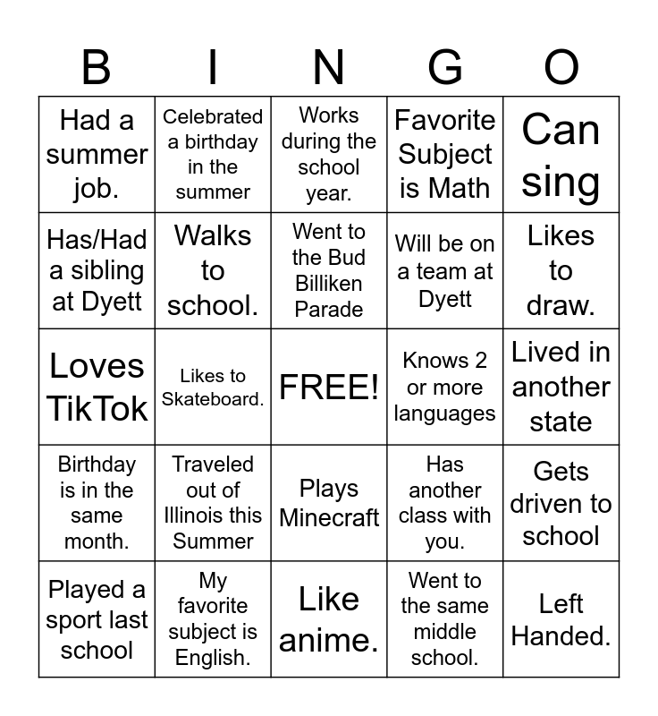 This bingo card has a free space and 24 words: Traveled out of Illinois this Summer, My favorite subject is English., Went to the Bud Billiken Parade, Played a sport last school, Can sing, Had a summer job., Has/Had a sibling at Dyett, Celebrated a birthday in the summer, Knows 2 or more languages, Plays Minecraft, Will be on a team at Dyett, Loves TikTok, Has another class with you., Gets driven to school, Walks to school., Went to the same middle school., Lived in another state, Works during the school year., Likes to draw., Likes to Skateboard., Left Handed., Birthday is in the same month., Favorite Subject is Math and Like anime..