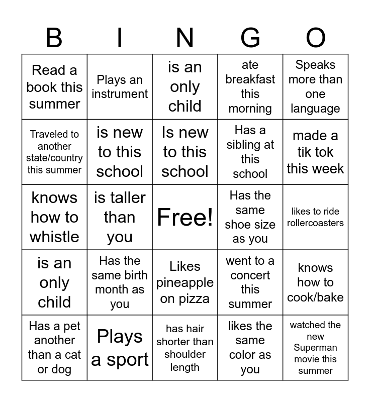 This bingo card has a free space and 24 words: Has the same birth month as you, Plays a sport, Is new to this school, Has a pet another than a cat or dog, Speaks more than one language, Read a book this summer, Traveled to another state/country this summer, Plays an instrument, Has the same shoe size as you, Likes pineapple on pizza, Has a sibling at this school, knows how to whistle, went to a concert this summer, knows how to cook/bake, is new to this school, likes the same color as you, likes to ride rollercoasters, is an only child, made a tik tok this week, is taller than you, watched the new Superman movie this summer, is an only child, ate breakfast this morning and has hair shorter than shoulder length.