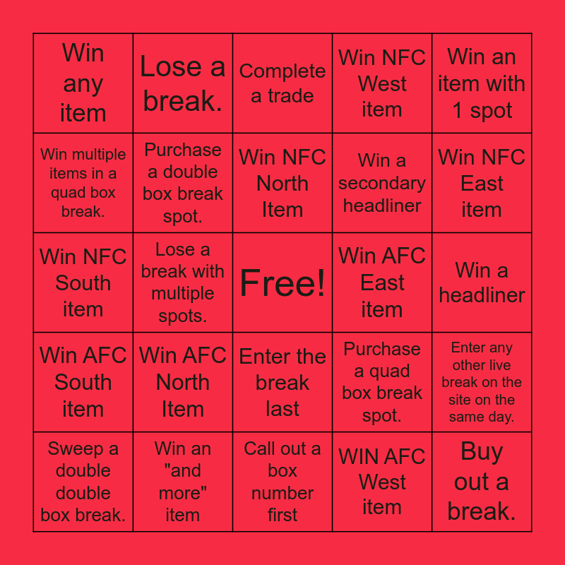 This bingo card has a free space and 24 words: Win AFC North Item, Win an "and more" item, Win NFC North Item, Sweep a double double box break., Win an item with 1 spot, Win any item, Win multiple items in a quad box break., Lose a break., Win AFC East item, Enter the break last, Win a secondary headliner, Win NFC South item, Purchase a quad box break spot., Enter any other live break on the site on the same day., Purchase a double box break spot., WIN AFC West item, Win a headliner, Complete a trade, Win NFC East item, Lose a break with multiple spots., Buy out a break., Win AFC South item, Win NFC West item and Call out a box number first.