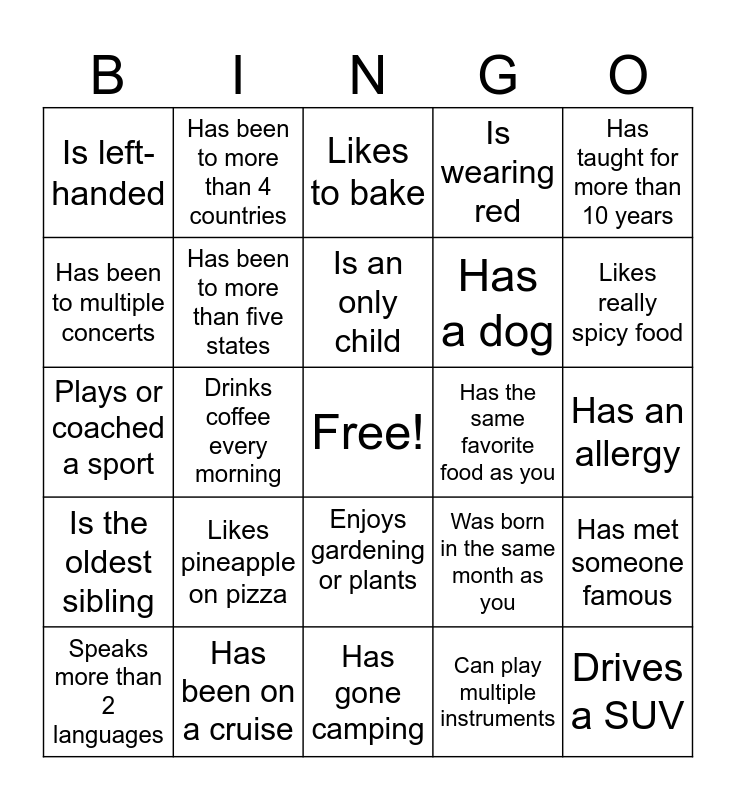 This bingo card has a free space and 24 words: Speaks more than 2 languages, Likes pineapple on pizza, Is an only child, Can play multiple instruments, Has taught for more than 10 years, Is left-handed, Has been to more than 4 countries, Likes to bake, Has the same favorite food as you, Has an allergy, Plays or coached a sport, Has been to more than five states, Was born in the same month as you, Has met someone famous, Has been to multiple concerts, Has been on a cruise, Has gone camping, Is wearing red, Likes really spicy food, Is the oldest sibling, Drinks coffee every morning, Enjoys gardening or plants, Has a dog and Drives a SUV.