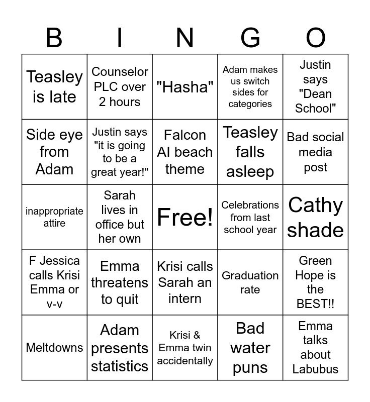 This bingo card has a free space and 25 words: Emma threatens to quit, Krisi & Emma twin accidentally, Falcon AI beach theme, Meltdowns, Justin says "Dean School", Teasley is late, Side eye from Adam, Counselor PLC over 2 hours, Celebrations from last school year, Krisi calls Sarah an intern, Teasley falls asleep, inappropriate attire, Graduation rate, Green Hope is the BEST!!, Justin says "it is going to be a great year!", Walmart bagels, Cathy shade, "Hasha", Bad social media post, Sarah lives in office but her own, Emma talks about Labubus, Adam presents statistics, F Jessica calls Krisi Emma or v-v, Adam makes us switch sides for categories and Bad water puns.