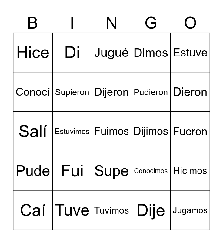 This bingo card has a free space and 24 words: Fui, Tuve, Dijeron, Caí, Estuve, Hice, Conocí, Di, Dijimos, Supe, Pudieron, Salí, Conocimos, Hicimos, Supieron, Dije, Fueron, Jugué, Dieron, Estuvimos, Jugamos, Pude, Dimos and Tuvimos.
