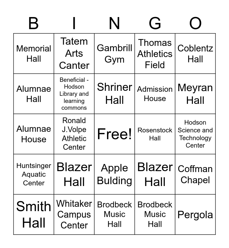 This bingo card has a free space and 24 words: Blazer Hall, Whitaker Campus Center, Shriner Hall, Smith Hall, Coblentz Hall, Memorial Hall, Alumnae Hall, Tatem Arts Canter, Rosenstock Hall, Apple Bulding, Admission House, Alumnae House, Blazer Hall, Coffman Chapel, Beneficial -Hodson Library and learning commons, Brodbeck Music Hall, Hodson Science and Technology Center, Gambrill Gym, Meyran Hall, Ronald J.Volpe Athletic Center, Pergola, Huntsinger Aquatic Center, Thomas Athletics Field and Brodbeck Music Hall.