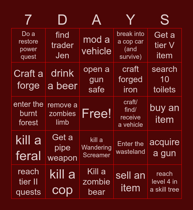 This bingo card has a free space and 24 words: Get a pipe weapon, kill a cop, open a gun safe, reach tier II quests, Get a tier V item, Do a restore power quest, Craft a forge, find trader Jen, craft/ find/ receive a vehicle, kill a Wandering Screamer, craft forged iron, enter the burnt forest, Enter the wasteland, acquire a gun, drink a beer, sell an item, buy an item, mod a vehicle, search 10 toilets, remove a zombies limb, reach level 4 in a skill tree, kill a feral, break into a cop car (and survive) and Kill a zombie bear.