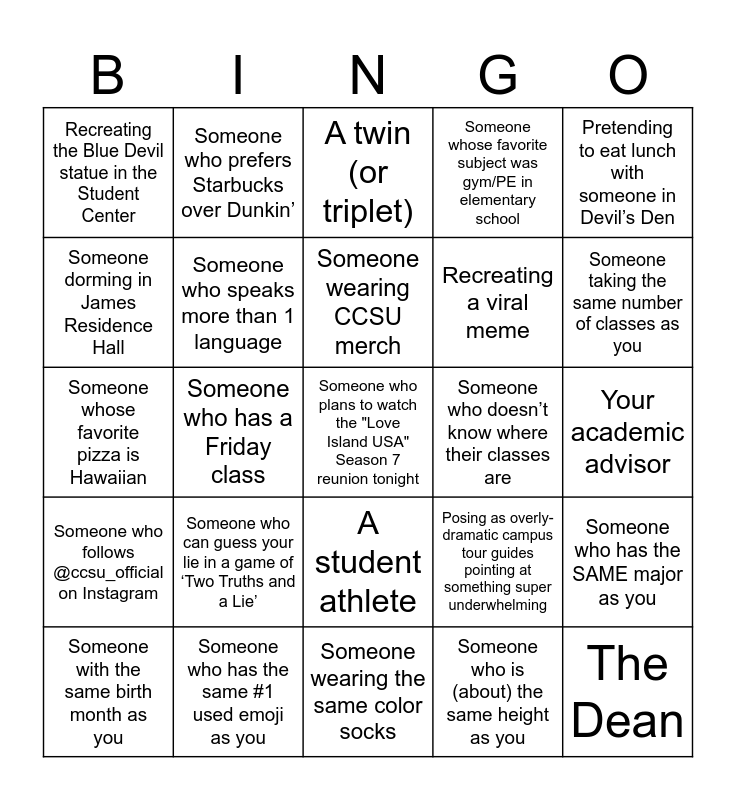 This bingo card has 25 words: Someone who can guess your lie in a game of ‘Two Truths and a Lie’, Someone wearing the same color socks, Someone wearing CCSU merch, Someone with the same birth month as you, Pretending to eat lunch with someone in Devil’s Den, Recreating the Blue Devil statue in the Student Center, Someone dorming in James Residence Hall, Someone who prefers Starbucks over Dunkin’, Someone who doesn’t know where their classes are, A student athlete, Recreating a viral meme, Someone whose favorite pizza is Hawaiian, Posing as overly-dramatic campus tour guides pointing at something super underwhelming, Someone who has the SAME major as you, Someone who speaks more than 1 language, The Dean, Your academic advisor, A twin (or triplet), Someone taking the same number of classes as you, Someone who has a Friday class, Someone who plans to watch the "Love Island USA" Season 7 reunion tonight, Someone who has the same #1 used emoji as you, Someone who follows @ccsu_official on Instagram, Someone whose favorite subject was gym/PE in elementary school and Someone who is (about) the same height as you.