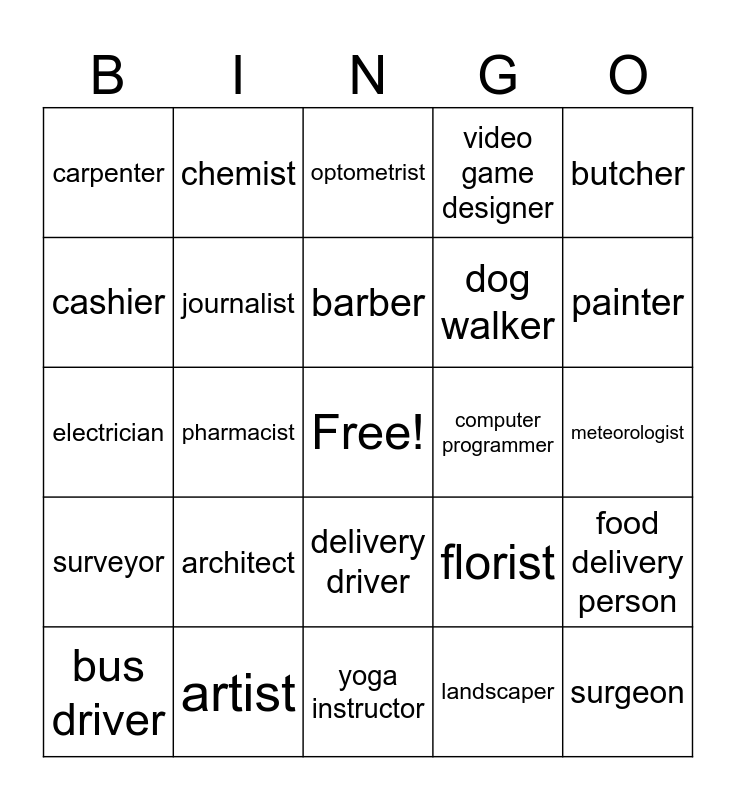 This bingo card has a free space and 24 words: architect, artist, barber, bus driver, butcher, carpenter, cashier, chemist, computer programmer, delivery driver, dog walker, electrician, florist, food delivery person, journalist, landscaper, meteorologist, optometrist, painter, pharmacist, surgeon, surveyor, video game designer and yoga instructor.