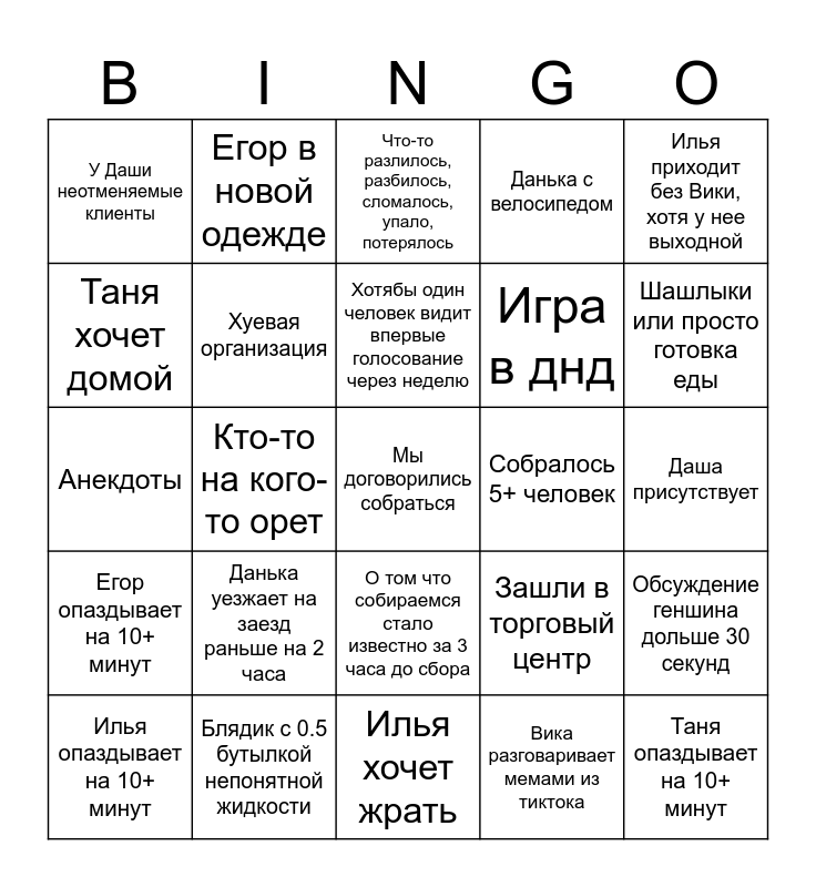 This bingo card has a free space and 39 words: 2 часа ходьбы по всему району, Спонтанный поход за едой, Таня овощная без кофе, Хуевая организация, Илья опаздывает на 10+ минут, О том что собираемся стало известно за 3 часа до сбора, Хотябы один человек видит впервые голосование через неделю, Блядик говорит что будет в последний момент, Илья приходит без Вики, хотя у нее выходной, Егор опаздывает на 10+ минут, Кто-то на кого-то орет, Данька с велосипедом, Таня опаздывает на 10+ минут, Даша присутствует, Собралось 5+ человек, Данька уезжает на заезд раньше на 2 часа, Данька написал утром что поедет на заезд вместо встречи, У Даши неотменяемые клиенты, Свинтус, Зашли в торговый центр, Таня хочет домой, Илья хочет жрать, Игра в днд, Шашлыки или просто готовка еды, Потерялись или разделились, Снято новое мемное видео, Кто-то не идет из-за погоды, Таня покупает кофе, Данька одет как бомж, Егор в новой одежде, Кто-то что-то забыл, Заход в АТБ в конце прогулки, Что-то разлилось, разбилось, сломалось, упало, потерялось, Блядик с 0.5 бутылкой непонятной жидкости, Вика разговаривает мемами из тиктока, Егор говорит про персону, Обсуждение геншина дольше 30 секунд, Анекдоты and Кого-то пизданули.