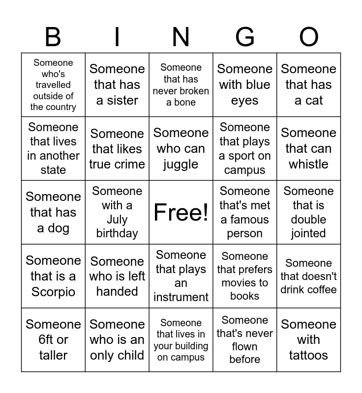 This bingo card has a free space and 24 words: Someone who is left handed, Someone who is an only child, Someone who can juggle, Someone 6ft or taller, Someone that has a cat, Someone who's travelled outside of the country, Someone that lives in another state, Someone that has a sister, Someone that's met a famous person, Someone that plays an instrument, Someone that plays a sport on campus, Someone that has a dog, Someone that prefers movies to books, Someone that doesn't drink coffee, Someone that likes true crime, Someone that's never flown before, Someone that is double jointed, Someone that has never broken a bone, Someone that can whistle, Someone with a July birthday, Someone with tattoos, Someone that is a Scorpio, Someone with blue eyes and Someone that lives in your building on campus.