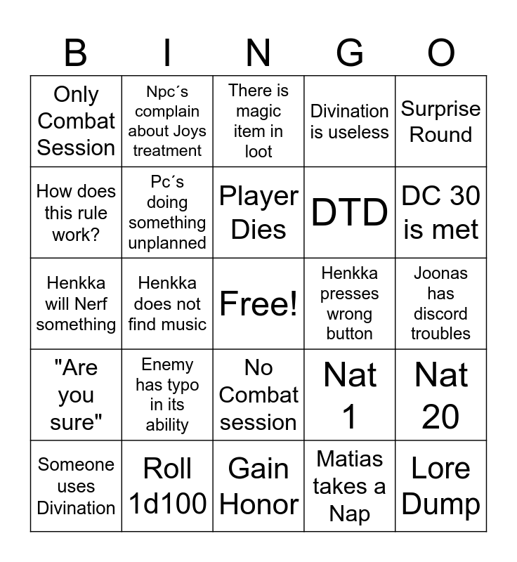 This bingo card has a free space and 24 words: Enemy has typo in its ability, Roll 1d100, Player Dies, Someone uses Divination, Surprise Round, Only Combat Session, How does this rule work?, Npc´s complain about Joys treatment, Henkka presses wrong button, No Combat session, DTD, Henkka will Nerf something, Nat 1, Nat 20, Pc´s doing something unplanned, Matias takes a Nap, Joonas has discord troubles, There is magic item in loot, DC 30 is met, Henkka does not find music, Lore Dump, "Are you sure", Divination is useless and Gain Honor.