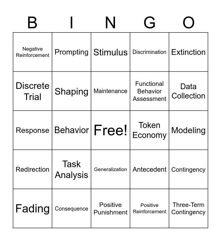 This bingo card has a free space and 24 words: Task Analysis, Consequence, Maintenance, Fading, Extinction, Negative Reinforcement, Discrete Trial, Prompting, Token Economy, Generalization, Functional Behavior Assessment, Response, Antecedent, Contingency, Shaping, Positive Reinforcement, Modeling, Stimulus, Data Collection, Behavior, Three-Term Contingency, Redirection, Discrimination and Positive Punishment.