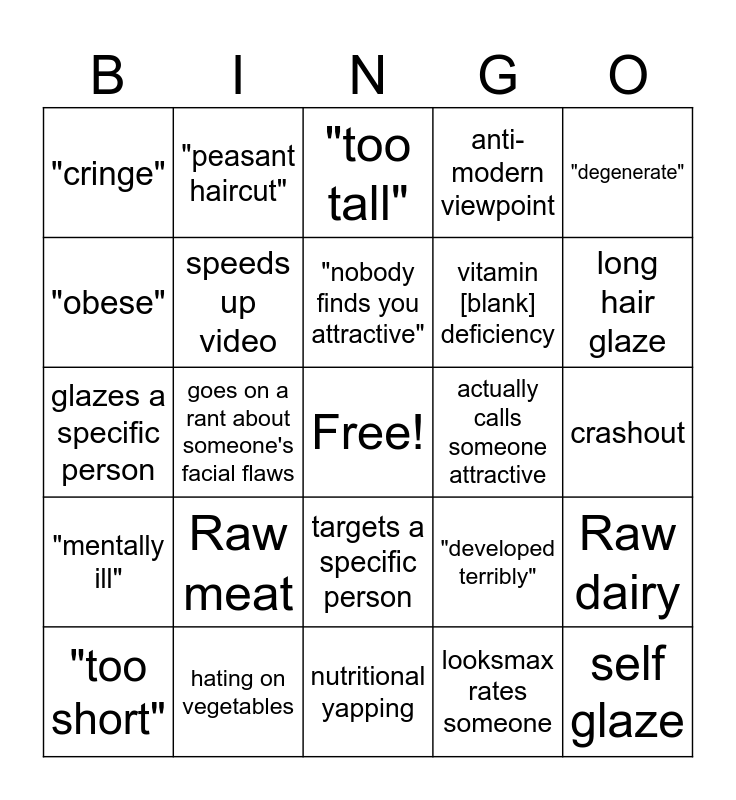 This bingo card has a free space and 24 words: Raw meat, hating on vegetables, "nobody finds you attractive", "too short", "degenerate", "cringe", "obese", "peasant haircut", actually calls someone attractive, targets a specific person, vitamin [blank] deficiency, glazes a specific person, "developed terribly", Raw dairy, speeds up video, looksmax rates someone, crashout, "too tall", long hair glaze, goes on a rant about someone's facial flaws, self glaze, "mentally ill", anti-modern viewpoint and nutritional yapping.