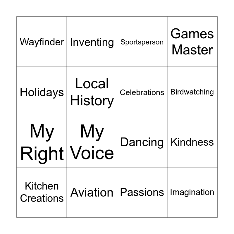 This bingo card has 37 words: Free!, Folklore, Guiding Glow, Celebrations, Crafts, Book reviewer, Birdwatching, Safety, Holidays, Animal Helper, Kindness, Games Master, Kitchen Creations, Passions, Local History, Imagination, Painting, Sportsperson, Mindfulness, Aviation, Wayfinder, My Voice, Charities, Mechanic, Jobs, Languages, Inventing, Speaking Out, Zero Waste, Space, Archaelogy, Grow your Own, Dancing, Baking, Performing, My Right and Collecting.