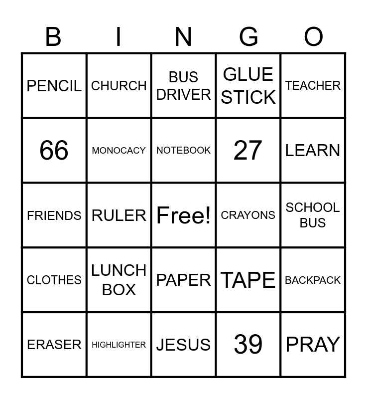 This bingo card has a free space and 28 words: BACKPACK, BIBLE, 27, 39, 66, BUS DRIVER, CHURCH, CLOTHES, CRAYONS, ERASER, FRIENDS, GLUE STICK, HIGHLIGHTER, JESUS, LEARN, LOVE, LUNCH BOX, MONOCACY, NOTEBOOK, PAPER, PENCIL, POWER, PRAY, RULER, SCHOOL BUS, TAPE, TEACHER and TISSUES.
