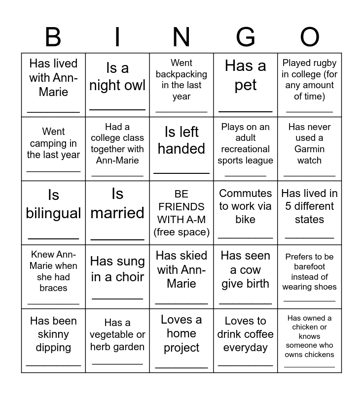 This bingo card has a free space and 24 words: Has sung in a choir _______, Has a vegetable or herb garden _________, Is left handed _______, Has been skinny dipping _________, Played rugby in college (for any amount of time) _________, Has lived with Ann-Marie ________, Went camping in the last year __________, Is a night owl _______, Commutes to work via bike _________, Has skied with Ann-Marie ________, Plays on an adult recreational sports league ________, Is bilingual ______, Has seen a cow give birth ________, Prefers to be barefoot instead of wearing shoes ___________, Had a college class together with Ann-Marie __________, Loves to drink coffee everyday _________, Has lived in 5 different states ________, Went backpacking in the last year __________, Has never used a Garmin watch __________, Is married ______, Has owned a chicken or knows someone who owns chickens ____________, Knew Ann-Marie when she had braces __________, Has a pet ______ and Loves a home project ________.