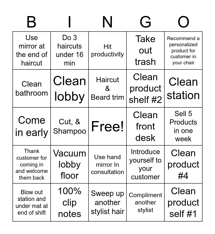 This bingo card has a free space and 33 words: Say”welcome to great clips” to everyone., Stay late, Cut, & Shampoo, Clean windows, Thank customer for coming in and welcome them back, Clean lobby, Recommend a personalized product for customer in your chair, Blow out station and under mat at end of shift, Do 3 haircuts under 16 min, Clean sails, Haircut & Beard trim, Hit productivity, Get 1 google review, Use customer name in, Clean front desk, Clean station, 100% clip notes, Come in early, Vacuum lobby floor, Introduce yourself to your customer, Use hand mirror In consultation, Pick up a shift, Use mirror at the end of haircut, Sell 5 Products in one week, Sweep up another stylist hair, Clean product self #1, Take out trash, Clean product shelf #2, Clean bathroom, Clean product #4, Clean product self #3, Compliment another stylist and Check/ validate customer address.