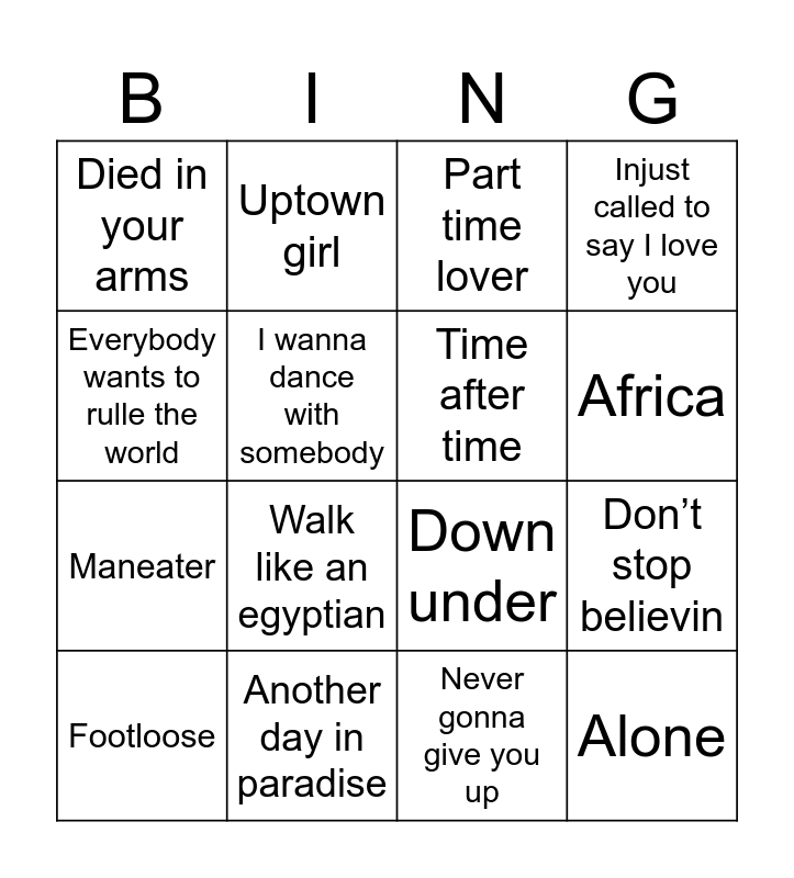 This bingo card has 64 words: Free!, Eye of the tiger, Billy Jean, Every breath you take, Careless whisper, Take on me, Uptown girl, Girls just want to have fun, Africa, Sweet child of mine, Living on a prayer, Sweet dreams, Never gonna give you up, Everybody wants to rulle the world, Bettie Davis eyes, I wanna dance with somebody, Don’t stop believin, Died in your arms, Karma chameleon, Maneater, Dancing in the dark, Alone, Injust called to say I love you, Don’t you forget about me, Heaven is a place on earth, With or without you, In the air tonight, Caribean Queen, Jump, Like a prayer, West end girls, Under pressure, Your love, Don’t you want me, Walk like an egyptian, Nothing’s gonna stop us now, Beat it, I want to know what love is, You give love a bad name, Time after time, Down under, Another day in paradise, I love rock ‘n roll, Old time rock’n roll, Forever young, Footloose, Total eclipse of the heart, Another one bites the dust, Smooth operator, Right here waiting, Gimmie all your lovin’, The Look, Hurt so good, Another brick in the wall, Come on Eileen, Call me, Part time lover, We built this city, Don’t worry be happy, Glory of love, Waiting for a girl like you, The best, Jack and Dianne and The time of my life.