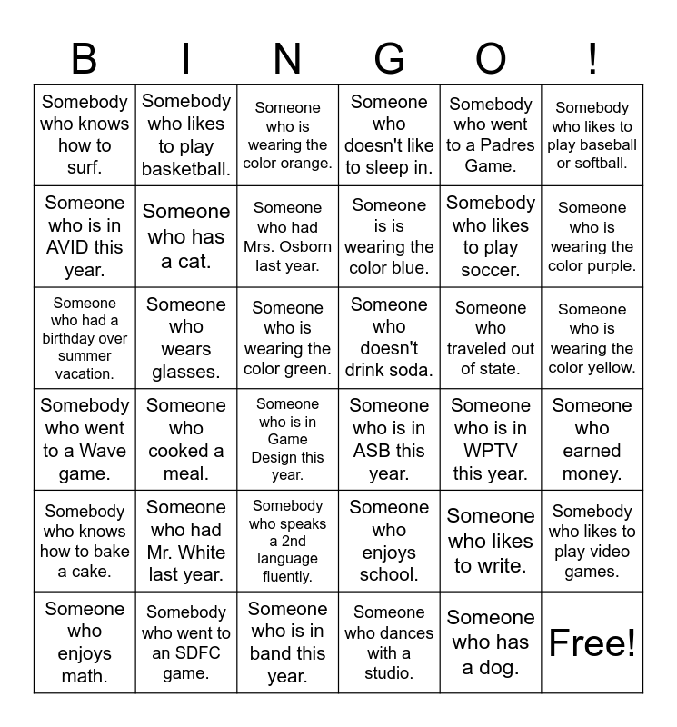 This bingo card has 42 words: Someone who has a dog., Someone who has a cat., Someone who has fish., Someone who traveled out of state., Someone who earned money., Someone who cooked a meal., Someone who had a birthday over summer vacation., Someone who is wearing the color red., Someone who is wearing the color orange., Someone who is wearing the color yellow., Someone who is wearing the color green., Someone is is wearing the color blue., Someone who is wearing the color purple., Somebody who went to a Padres Game., Somebody who went to an SDFC game., Somebody who went to a Wave game., Somebody who likes to play video games., Somebody who likes to play soccer., Free!, Somebody who likes to play basketball., Somebody who likes to play baseball or softball., Somebody who speaks a 2nd language fluently., Somebody who knows how to bake a cake., Somebody who knows how to surf., Someone who enjoys reading., Someone who enjoys math., Someone who had Mrs. Osborn last year., Someone who had Mrs. Felix last year., Someone who had Mr. White last year., Someone who likes to write., Someone who likes sushi., Someone who doesn't drink soda., Someone who is in AVID this year., Someone who is in WPTV this year., Someone who is in band this year., Someone who is in Game Design this year., Someone who is in ASB this year., Someone who wears glasses., Someone who enjoys school., Someone who dances with a studio., Someone who doesn't like to sleep in. and Someone who enjoys history..