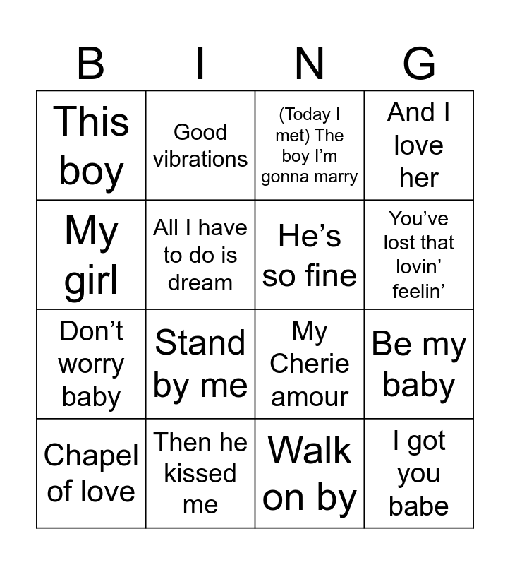 This bingo card has 20 words: Be my baby, I say a little prayer, (Today I met) The boy I’m gonna marry, How sweet it is (to be loved by you), Chapel of love, My girl, Then he kissed me, This boy, Don’t worry baby, Good vibrations, Stand by me, My Cherie amour, All I have to do is dream, I got you babe, He’s so fine, This magic moment, You’ve lost that lovin’ feelin’, And I love her, Walk on by and This will be our year.