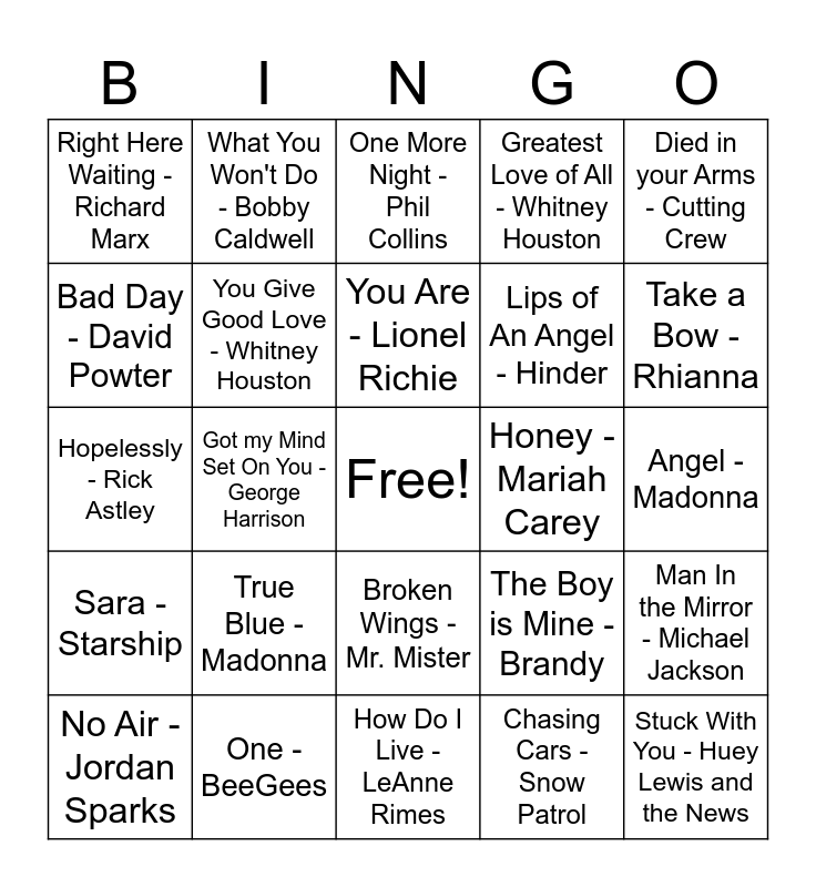 This bingo card has a free space and 40 words: All Night Long - Lionel Richie, Hopelessly - Rick Astley, Don't Know Much - Linda Ronstadt, You Give Good Love - Whitney Houston, One - BeeGees, Broken Wings - Mr. Mister, You Are - Lionel Richie, I Think We're Alone Now - Tiffany, Died in your Arms - Cutting Crew, Sara - Starship, Got my Mind Set On You - George Harrison, Greatest Love of All - Whitney Houston, Stuck With You - Huey Lewis and the News, Angel - Madonna, Honey - Mariah Carey, True Blue - Madonna, Never Gonna Give You Up - Rick Astley, Right Here Waiting - Richard Marx, African- Toto, One More Night - Phil Collins, Man In the Mirror - Michael Jackson, Chasing Cars - Snow Patrol, Lips of An Angel - Hinder, Bad Day - David Powter, Waiting on the World to Change - John Mayer, Breathless - The Corrs, Irreplaceable - Beyonce, Because You Loved Me - Celine, If I Ain't Got You - Alicia Keys, I Swear - All 4 One, Waterfalls - TLC, No Air - Jordan Sparks, Sexual Healing - Marvin Gaye, The Boy is Mine - Brandy, Take a Bow - Rhianna, How Do I Live - LeAnne Rimes, This I Promise You - NSYNC, Sara Smile - Hall and Oates, What You Won't Do - Bobby Caldwell and PYT - Michael Jackson.