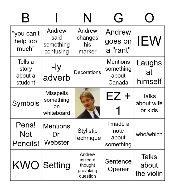 This bingo card has a free space and 31 words: Andrew made a joke, Setting, Decorations, Rough Draft, IEW, "you can't help too much", Misspells something on whiteboard, Andrew asked a thought provoking question, Mentions something about Canada, Talks about the violin, KWO, Mentions Dr. Webster, Sentence Opener, Andrew talks to an audience member, Pens! Not Pencils!, Topic Clincher, Stylistic Technique, EZ + 1, Talks about wife or kids, Dressups, Andrew said something confusing, Plot, I made a note about something, Laughs at himself, Symbols, -ly adverb, Andrew changes his marker, Andrew goes on a "rant", who/which, Tells a story about a student and Tells a corny joke.