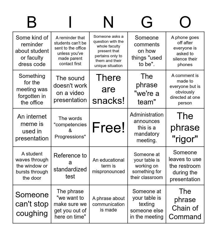 This bingo card has a free space and 34 words: Be careful about what you send through the email, Someone at your table is texting someone else in the meeting, The phrase "differentiated instruction", Seasoned veteran makes snarky comment, A student waves through the window or bursts through the door, The sound doesn't work on a video presentation, A phone goes off after everyone is asked to silence their phones, Someone can't stop coughing, A reminder that students can't be sent to the office unless you've made parent contact first, The phrase "college ready", There are snacks!, Someone asks a question with the whole faculty present that pertains only to them and their unique situation, Someone talks about literacy strategies, The rustling of keys, papers, etc. one minute before the scheduled end time even if someone is still presenting., Administration announces this is a mandatory meeting., A comment is made to everyone but is obviously directed at one person, The phrase "we want to make sure we get you out of here on time", An internet meme is used in presentation, Reference to a standardized test, Someone at your table is working on something for their classroom, An educational term is mispronounced, The phrase "aligned with our school/district goals", Some kind of reminder about student or faculty dress code, The phrase "rigor", A phrase about communication is made, The phrase Chain of Command, Someone comments on how things "used to be"., The presenter can't get the presentation to work correctly, The phrase "we're a team", Something for the meeting was forgotten in the office, The phrase "backward planning", The words "competencies & Progressions", Someone leaves to use the restroom during the presentation and Someone takes a call during the presentation.