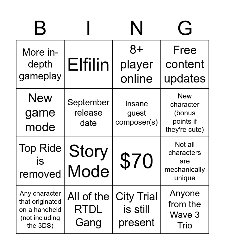 This bingo card has 16 words: All of the RTDL Gang, Not all characters are mechanically unique, 8+ player online, More in-depth gameplay, Top Ride is removed, Elfilin, $70, City Trial is still present, New game mode, September release date, Any character that originated on a handheld (not including the 3DS), Free content updates, Story Mode, New character (bonus points if they're cute), Insane guest composer(s) and Anyone from the Wave 3 Trio.