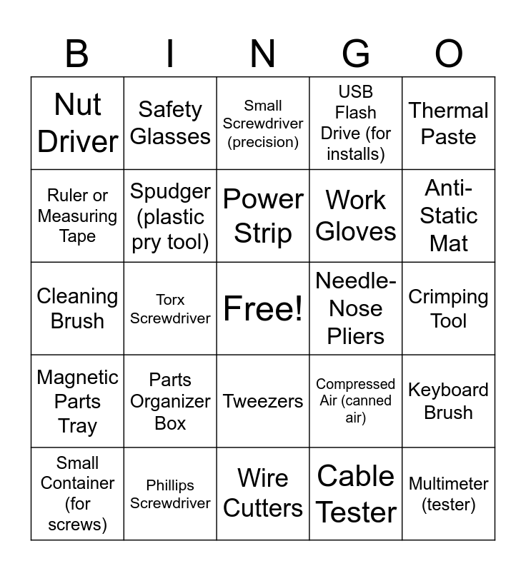 This bingo card has a free space and 30 words: Phillips Screwdriver, Flathead Screwdriver, Torx Screwdriver, Hex Driver, Nut Driver, Small Screwdriver (precision), Spudger (plastic pry tool), Tweezers, Needle-Nose Pliers, Wire Cutters, Crimping Tool, Multimeter (tester), Cable Tester, Anti-Static Wrist Strap, Anti-Static Mat, Flashlight, Compressed Air (canned air), Magnetic Parts Tray, Parts Organizer Box, Thermal Paste, Cleaning Brush, Microfiber Cloth, Safety Glasses, Work Gloves, Ruler or Measuring Tape, USB Flash Drive (for installs), Keyboard Brush, Small Container (for screws), Power Strip and Notebook & Pen.
