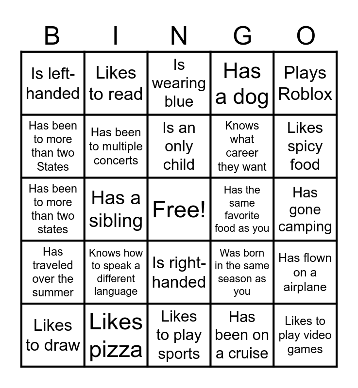 This bingo card has a free space and 24 words: Knows how to speak a different language, Likes pizza, Is an only child, Likes to draw, Plays Roblox, Is left-handed, Has been to more than two States, Likes to read, Has the same favorite food as you, Is right-handed, Knows what career they want, Has been to more than two states, Was born in the same season as you, Has flown on a airplane, Has been to multiple concerts, Has been on a cruise, Has gone camping, Is wearing blue, Likes spicy food, Has a sibling, Likes to play video games, Has traveled over the summer, Has a dog and Likes to play sports.