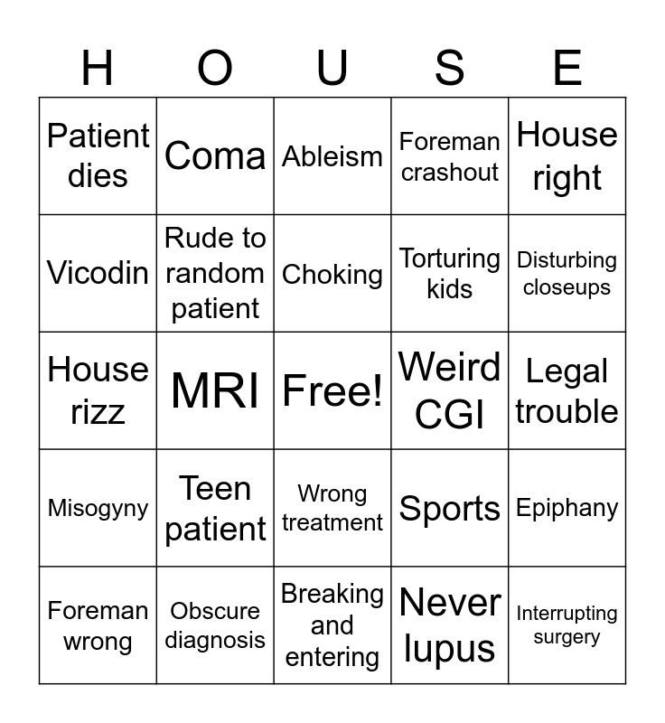 This bingo card has a free space and 33 words: Racism, Violence, MRI, Whiteboard, Misogyny, Rude to random patient, House right, Foreman wrong, Coma, Seizure, Choking, Ableism, House doesn’t do his job, House flirts with Wilson, Weird CGI, Disturbing closeups, Obscure diagnosis, House rizz, Teen patient, Sports, Wrong treatment, “Oh god. I need to go”, Patient dies, Legal trouble, Breaking and entering, Interrupting surgery, Foreman crashout, Torturing kids, Vicodin, Epiphany, Infidelity, Never lupus and Opening scene fakeout.