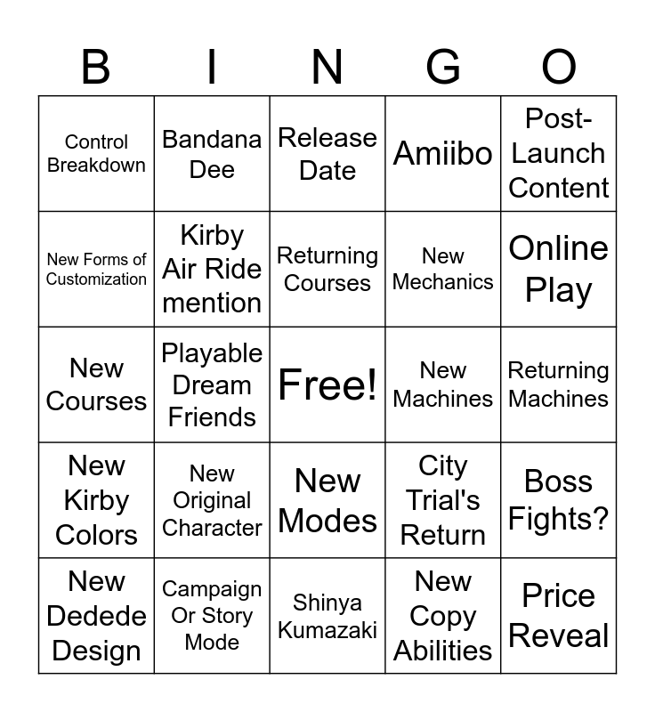 This bingo card has a free space and 24 words: New Original Character, Campaign Or Story Mode, Returning Courses, New Dedede Design, Post-Launch Content, Control Breakdown, New Forms of Customization, Bandana Dee, New Machines, New Modes, New Mechanics, New Courses, City Trial's Return, Boss Fights?, Kirby Air Ride mention, New Copy Abilities, Returning Machines, Release Date, Online Play, Playable Dream Friends, Price Reveal, New Kirby Colors, Amiibo and Shinya Kumazaki.
