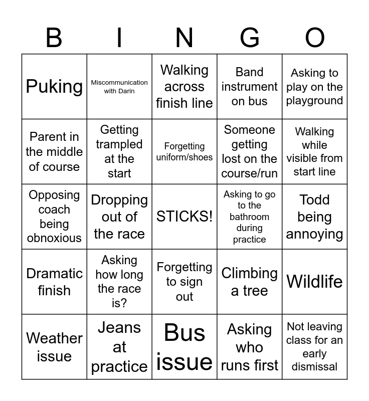 This bingo card has a free space and 24 words: Asking how long the race is?, Jeans at practice, Forgetting uniform/shoes, Weather issue, Asking to play on the playground, Puking, Parent in the middle of course, Miscommunication with Darin, Asking to go to the bathroom during practice, Forgetting to sign out, Someone getting lost on the course/run, Opposing coach being obnoxious, Climbing a tree, Wildlife, Getting trampled at the start, Asking who runs first, Todd being annoying, Walking across finish line, Walking while visible from start line, Dropping out of the race, Not leaving class for an early dismissal, Dramatic finish, Band instrument on bus and Bus issue.