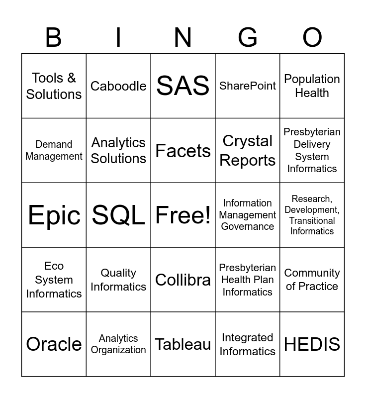 This bingo card has a free space and 30 words: Analytics Organization, System Services Informatics, SQL, Data & Analytics, Tools & Solutions, SAS, Analytics Solutions, Collibra, Information Management Governance, Tableau, Research, Development, Transitional Informatics, HEDIS, Integrated Informatics, Presbyterian Medical Group Informatics, Presbyterian Delivery System Informatics, Mede Analytics, Presbyterian Health Plan Informatics, Eco System Informatics, Quality Informatics, Population Health, Epic, Health Rules Payor, Caboodle, Crystal Reports, Demand Management, SharePoint, Community of Practice, Oracle, Facets and Citrix.