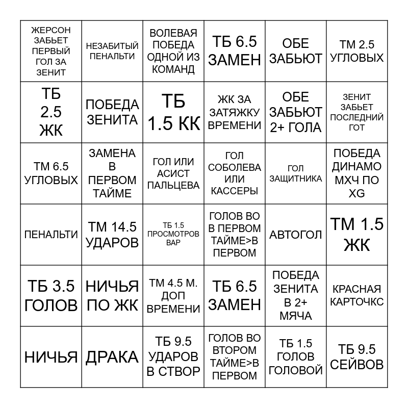 This bingo card has 36 words: ТБ 6.5 ЗАМЕН, ТМ 4.5 М. ДОП ВРЕМЕНИ, ГОЛОВ ВО ВТОРОМ ТАЙМЕ>В ПЕРВОМ, ТБ 2.5 ЖК, ПЕНАЛЬТИ, ГОЛ СОБОЛЕВА ИЛИ КАССЕРЫ, ПОБЕДА ЗЕНИТА, ТБ 9.5 УДАРОВ В СТВОР, ОБЕ ЗАБЬЮТ, ПОБЕДА ЗЕНИТА В 2+ МЯЧА, ЗЕНИТ ЗАБЬЕТ ПОСЛЕДНИЙ ГОТ, ТБ 6.5 ЗАМЕН, КРАСНАЯ КАРТОЧКС, ЗАМЕНА В ПЕРВОМ ТАЙМЕ, ЖК ЗА ЗАТЯЖКУ ВРЕМЕНИ, ЖЕРСОН ЗАБЬЕТ ПЕРВЫЙ ГОЛ ЗА ЗЕНИТ, ТБ 3.5 ГОЛОВ, ГОЛ ЗАЩИТНИКА, ТМ 6.5 УГЛОВЫХ, ВОЛЕВАЯ ПОБЕДА ОДНОЙ ИЗ КОМАНД, ГОЛ ИЛИ АСИСТ ПАЛЬЦЕВА, ТМ 14.5 УДАРОВ, ГОЛОВ ВО В ПЕРВОМ ТАЙМЕ>В ПЕРВОМ, ТБ 1.5 ПРОСМОТРОВ ВАР, АВТОГОЛ, НЕЗАБИТЫЙ ПЕНАЛЬТИ, ОБЕ ЗАБЬЮТ 2+ ГОЛА, ДРАКА, ТБ 1.5 КК, ТМ 2.5 УГЛОВЫХ, ТБ 9.5 СЕЙВОВ, НИЧЬЯ, ТМ 1.5 ЖК, ПОБЕДА ДИНАМО МХЧ ПО XG, НИЧЬЯ ПО ЖК and ТБ 1.5 ГОЛОВ ГОЛОВОЙ.