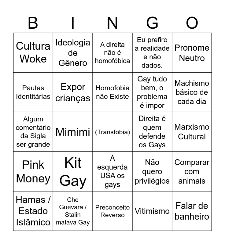 This bingo card has a free space and 24 words: Kit Gay, Che Guevara / Stalin matava Gay, Homofobia não Existe, Hamas / Estado Islâmico, Pronome Neutro, Cultura Woke, Pautas Identitárias, Ideologia de Gênero, Direita é quem defende os Gays, A esquerda USA os gays, Gay tudo bem, o problema é impor, Algum comentário da Sigla ser grande, Não quero privilégios, Comparar com animais, Expor crianças, Vitimismo, Marxismo Cultural, A direita não é homofóbica, Machismo básico de cada dia, Mimimi, Falar de banheiro, Pink Money, Eu prefiro a realidade e não dados. and Preconceito Reverso.
