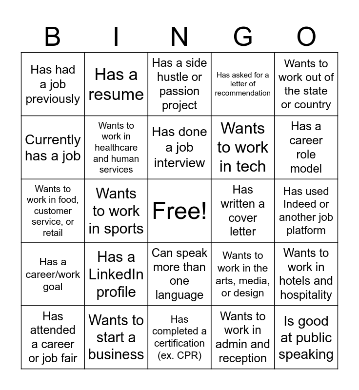 This bingo card has a free space and 24 words: Has a LinkedIn profile, Wants to start a business, Has done a job interview, Has attended a career or job fair, Wants to work out of the state or country, Has had a job previously, Currently has a job, Has a resume, Has written a cover letter, Can speak more than one language, Wants to work in tech, Wants to work in food, customer service, or retail, Wants to work in the arts, media, or design, Wants to work in hotels and hospitality, Wants to work in healthcare and human services, Wants to work in admin and reception, Has used Indeed or another job platform, Has a side hustle or passion project, Has a career role model, Wants to work in sports, Is good at public speaking, Has a career/work goal, Has asked for a letter of recommendation and Has completed a certification (ex. CPR).