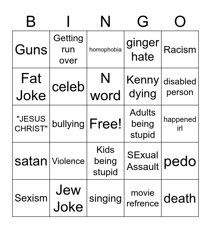 This bingo card has a free space and 24 words: Violence, Jew Joke, N word, Sexism, Racism, Guns, Fat Joke, Getting run over, Adults being stupid, Kids being stupid, Kenny dying, "JESUS CHRIST", SExual Assault, pedo, celeb, movie refrence, happened irl, homophobia, disabled person, bullying, death, satan, ginger hate and singing.