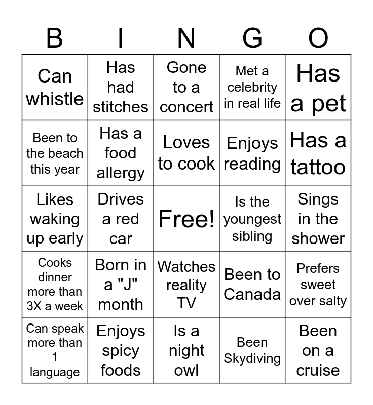 This bingo card has a free space and 24 words: Born in a "J" month, Enjoys spicy foods, Loves to cook, Can speak more than 1 language, Has a pet, Can whistle, Been to the beach this year, Has had stitches, Is the youngest sibling, Watches reality TV, Enjoys reading, Likes waking up early, Been to Canada, Prefers sweet over salty, Has a food allergy, Been Skydiving, Sings in the shower, Gone to a concert, Has a tattoo, Drives a red car, Been on a cruise, Cooks dinner more than 3X a week, Met a celebrity in real life and Is a night owl.