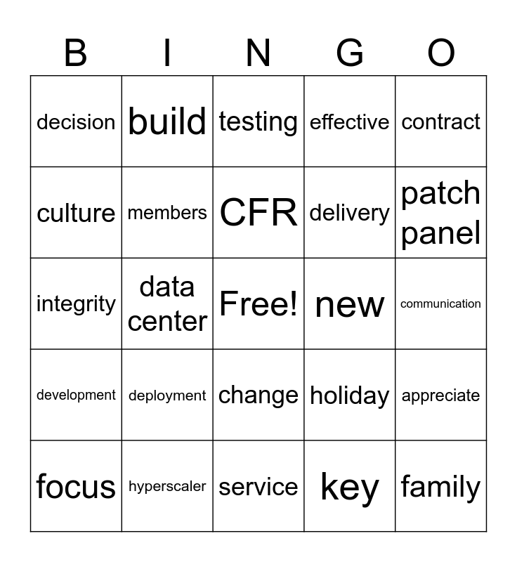 This bingo card has a free space and 65 words: achievement, Americas, answer, appreciate, autmation, break/fix, build, business, CFR, challenge, change, collaboration, communication, contract, country, culture, data center, decision, deliver, delivery, deployment, development, effective, effiicient, employee, engineering, exciting, execution, family, fiber, focus, grow, growth, highlights, holiday, hyperscaler, India, integrity, key, meeting, members, Mexico, new, operate, optical, organization, patch panel, people, quality, question, recognize, recognition, server, service, speak up, team, technology, testing, thank you, ticket, transition, transport, update, vacation and ways of working.